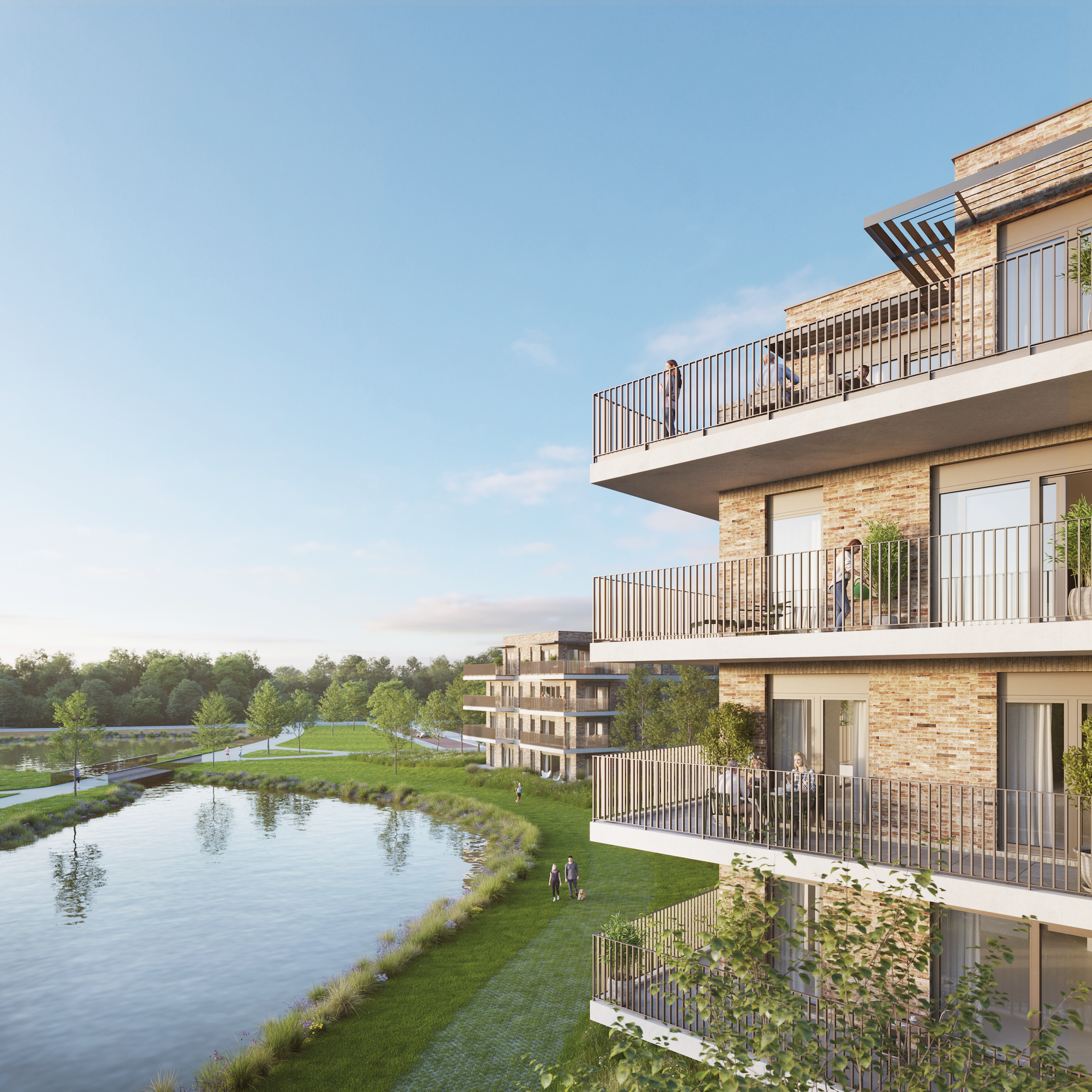 Ruimte en veel lichtinval typeren de hedendaagse architectuur die mooi ingepland staan langsheen de prachtige waterpartij.